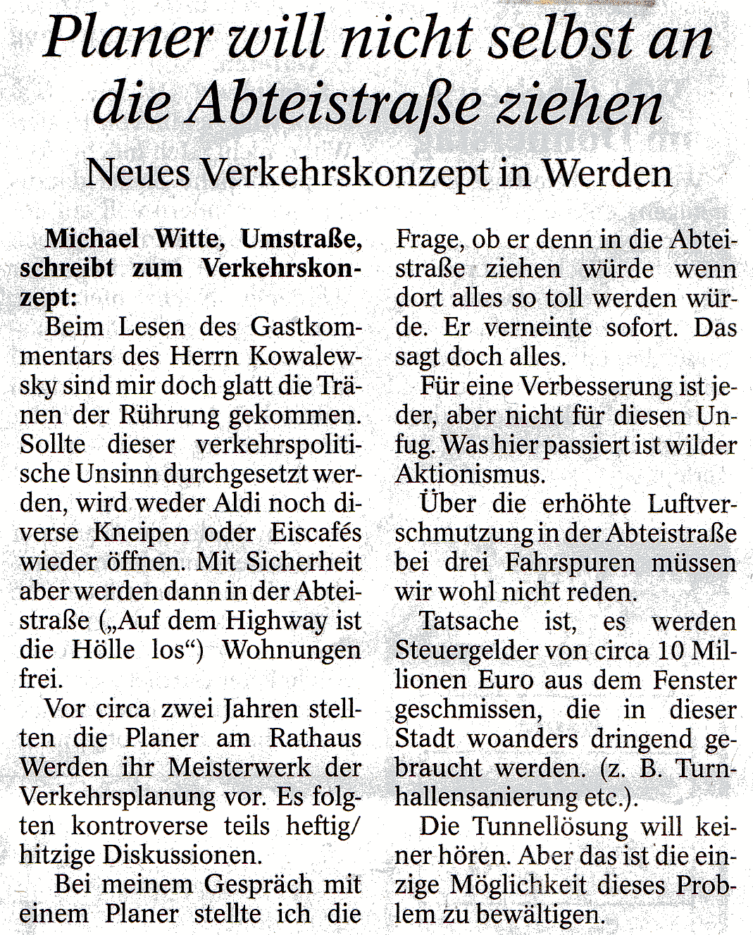 Bisher noch nicht veröffentlichter Leserbrief an Werdener Kurier